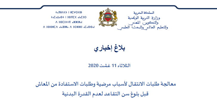 لائحة المستفيذات و المستفيدين من الانتقال بعد معالجة طلبات الانتقال لأسباب مرضية ومن من المعاش قبل بلوغ سن التقاعد لعدم القدرة البدنية لسنة 2020