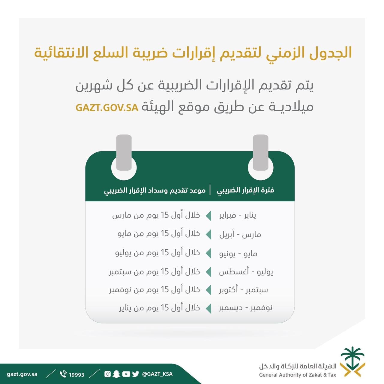 الهيئة العامة للزكاة والدخل A Twitter الزكاة والدخل تدعو منتجي السلع الانتقائية لتقديم إقراراتهم الضريبية للفترة الثانية قبل 15 مايو الجاري