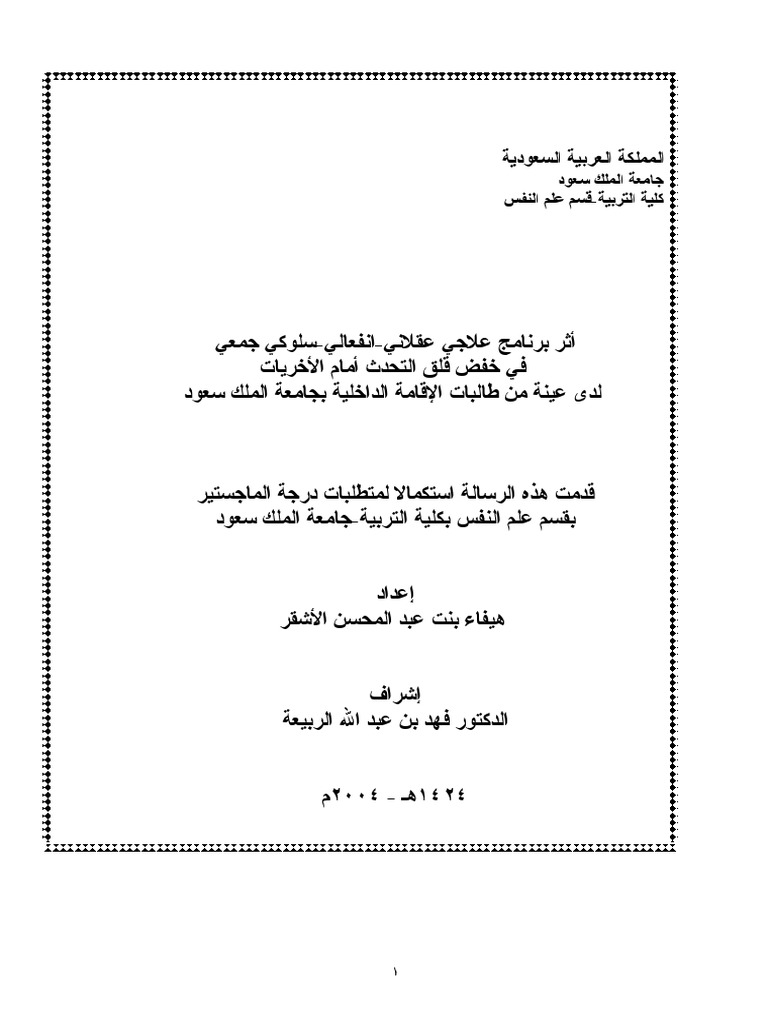 أثر برنامج علاجي عقلاني انفعالي سلوكي جمعي في خفض قلق التحدث أمام الأخريات لدى عينة من طالبات الإقامة الداخلية بجامعة الملك سعود